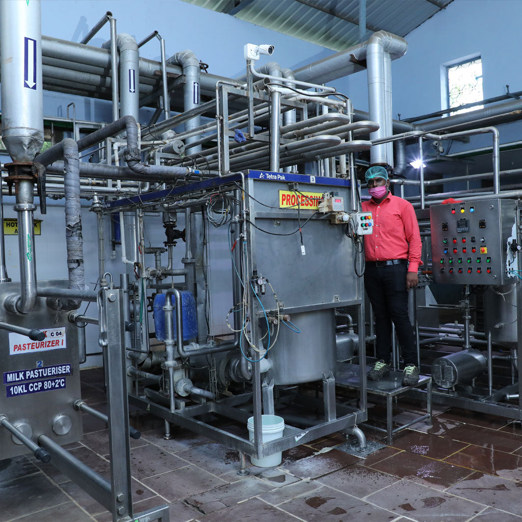 Our story begins right in your backyard! Tamil Milk Collection Centers (TCCs) are spread across the villages around you, making it convenient for our local dairy farmers to deliver the freshest milk. Managed by our dedicated team, these centers are the first step in the journey of your milk. Each batch is tested for FAT and solids-not-fat (SNF) using the latest technology, ensuring fair pricing and maintaining transparency at every step.